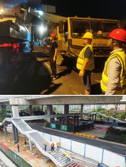 由于人行天橋項目建設(shè)所處的位置地下含高壓線等管線,施工環(huán)境較為復雜,且又處在交通通行量大的東環(huán)高速高架橋下,由于空間受限,鋼箱梁吊裝與高架橋最近的距離僅有5公分,吊裝難度極大。為此,我們采取雙吊車協(xié)同施工、錯峰施工和夜間施工的辦法。為確保施工安全,市政集團從上至下高度重視,由集團領(lǐng)導帶隊,項目總工及各職能部門主要人員齊上陣,從交通協(xié)調(diào),運梁車跟隨指導,安全措施落實及現(xiàn)場架梁的線位等多方面進行把控,主要負責人靠前指揮,帶領(lǐng)黨員干部及時協(xié)調(diào)解決吊裝過程中遇到的問題,充分發(fā)揮出黨支部戰(zhàn)斗堡壘和黨員的模范帶頭作用。