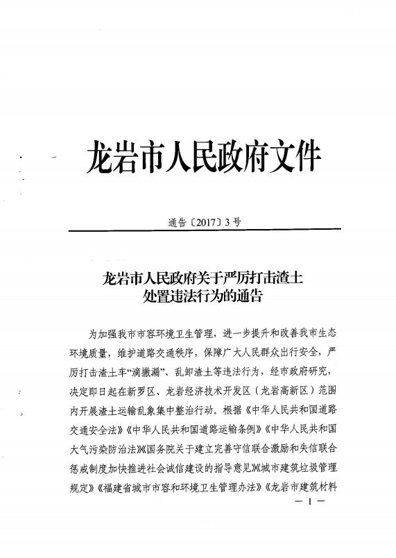 龍巖市人民政府關(guān)于嚴厲打擊渣土處置違法行為的通告(通告【2017】3號)
