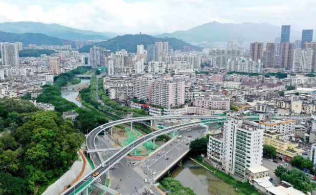 羅橋節(jié)點改造提升工程2019年11月開工建設(shè),2021年8月建成通車。該項目沿北環(huán)西路、龍興路設(shè)置南北分離式雙向四車道高架,南側(cè)接龍興路,北側(cè)接現(xiàn)狀北環(huán)西路,高架靠東側(cè)布置(緊貼烈士陵園),橋梁總長約1140米,凈寬約7.7米;在雙洋路、龍川北路、北環(huán)西路設(shè)置人行天橋,與山體步道銜接,以完善慢行系統(tǒng);在烈士陵園山體下采用明挖回填方式設(shè)置框涵,長度約225米,凈寬10.75米。工程投資1.4億元。